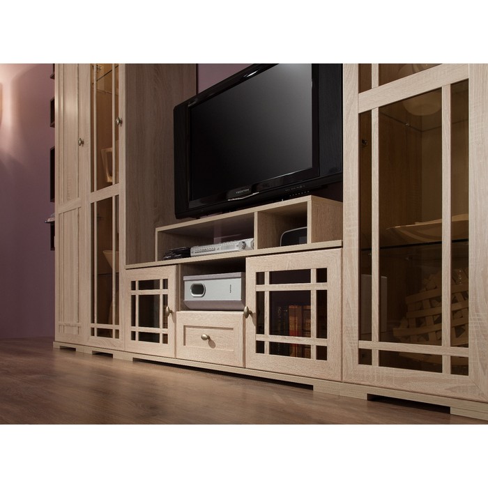 Выдвижной ящик оснащён шариковыми направляющими. Его можно не устанавливать, чтобы увеличить высоту ниши. Если нужно поднять телевизор, приобретите подставку для аудио- и видеоаппаратуры