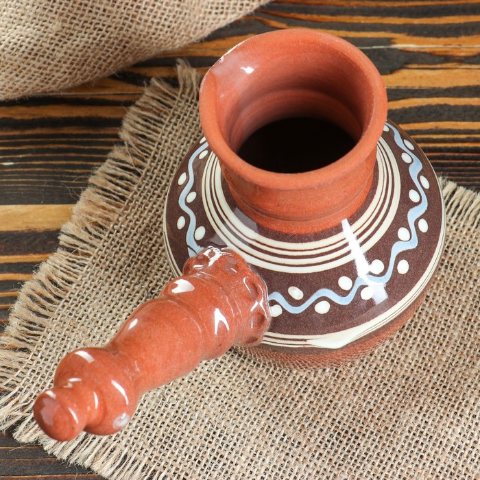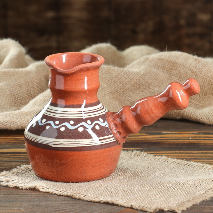 Турка изготовлена из обожжённой красной глины с глазурью. С помощью этого изделия вы сможете приготовить кофе на электрической плите. Теплопроводные свойства материала и толщина стенок сосуда позволяют напитку долго не остывать. После снятия турки с плиты кофе продолжает кипеть, за счёт этого полностью раскрывается его аромат.