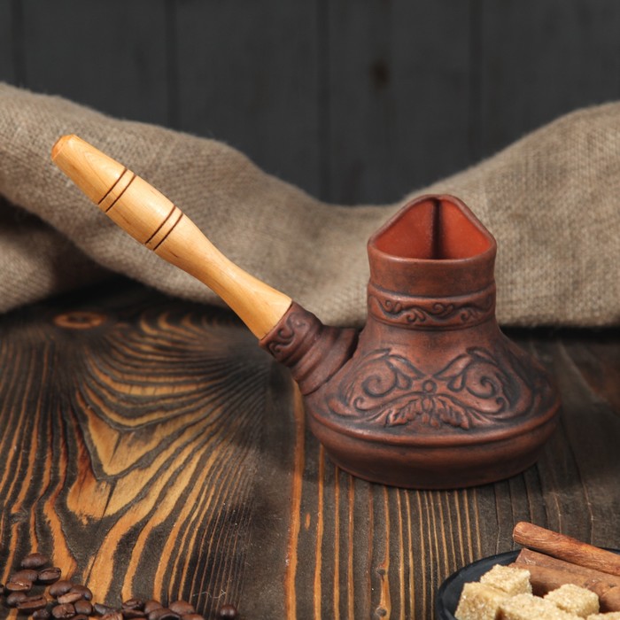 Турка изготовлена из обожжённой красной глины с глазурью. С помощью этого изделия вы сможете приготовить кофе на электрической плите. Теплопроводные свойства материала и толщина стенок сосуда позволяют напитку долго не остывать. После снятия турки с плиты кофе продолжает кипеть, за счёт этого полностью раскрывается его аромат.