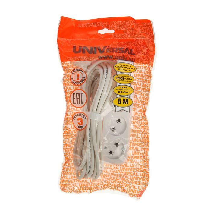 Удлинитель UNIVersal Е-203, 3 розетки, 5 м, ПВС 2х0.75, 10 А