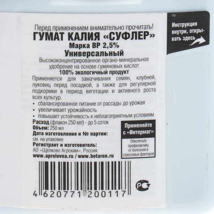 Удобрение органо-минеральное Гумат калия "Суфлер", универсальный, флакон, 250 мл