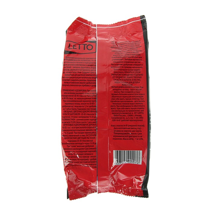Удобрение «Летто нитроаммофоска» позволяет за один приём производить подкормку сразу тремя питательными элементами. Обеспечивает значительную прибавку урожая и предохраняет почву от внесения лишних удобрений, которые могут нарушить процесс вегетации растений.