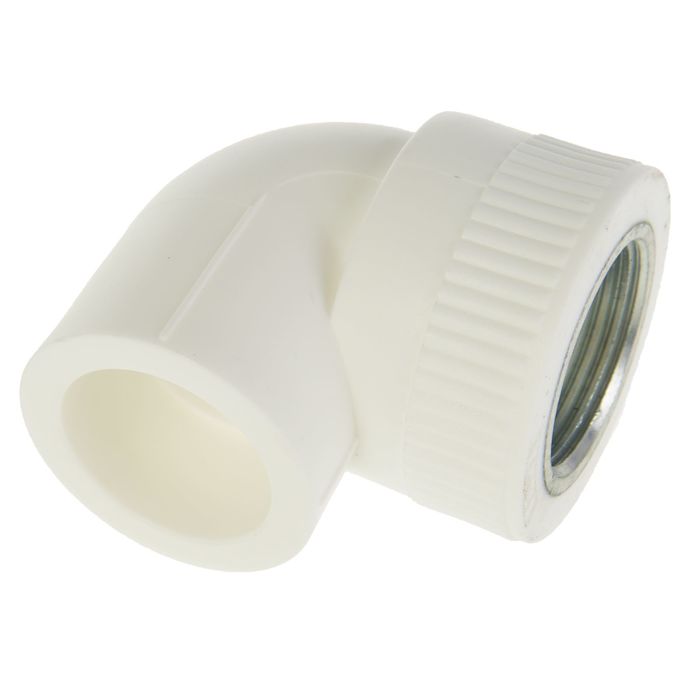 Уголок с внутренней резьбой соединяет полипропиленовые трубы с запорной арматурой или стальными трубами холодного и горячего водоснабжения под углом 90˚.
