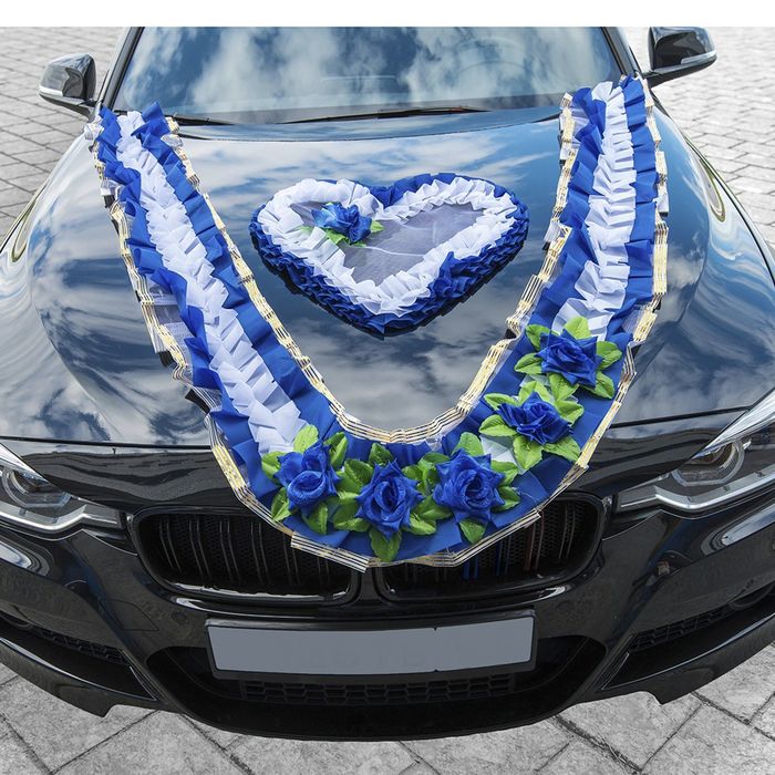 Изделие состоит из длинного широкого полотна и элемента с рюшами и искусственными цветами. Такое украшение создаст праздничную атмосферу, придаст свадебному кортежу торжественный вид и выделит его из общего потока машин.