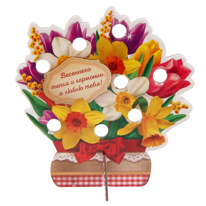 В комплект входит оригинальная картонная основа и записки с душевными пожеланиями. В подставке есть отверстия, куда нужно вставить бумажки, свернув их в свиток. Используйте входящие в комплект или сделайте свои, главное, что каждая записка несёт в себе тепло и нежные слова. Сделайте процесс ещё более интересным, добавив каждому пожеланию небольшой презент.