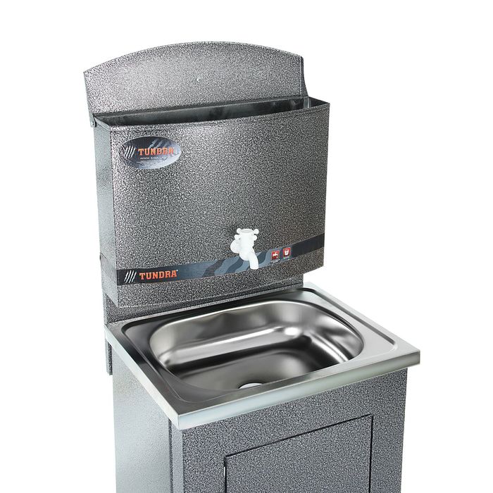 Умывальник TUNDRA — отличное приобретение для дачи, гаража, мастерской или других мест без центрального водоснабжения. Металлическая конструкция серебряного цвета проста в эксплуатации и уходе, обладает высокой износоустойчивостью. Раковина выполнена из нержавеющей стали, а на бак для воды нанесено невосприимчивое к коррозии запатентованное покрытие.