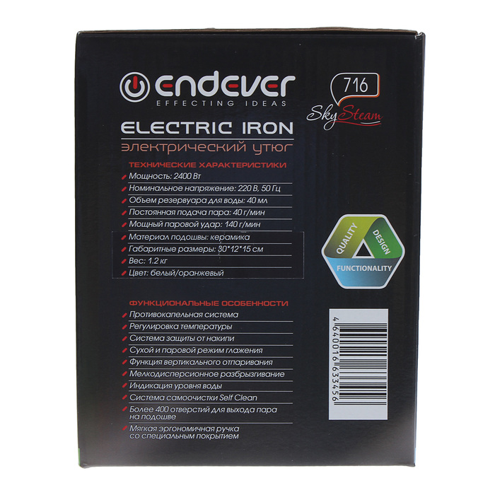 Утюг Endever SkySteam-716, 2400 Вт, керамическая подошва, самоотчистка, отпаривание, белый быстро и безопасно приведёт любую одежду и постельное бельё в порядок. Подошва легко скользит по ткани, разглаживая даже самые непослушные складки. Эргономичная ручка удобно лежит в руке во время глажки. Вы сможете самостоятельно выбрать температурный режим в зависимости от степени деликатности материала.