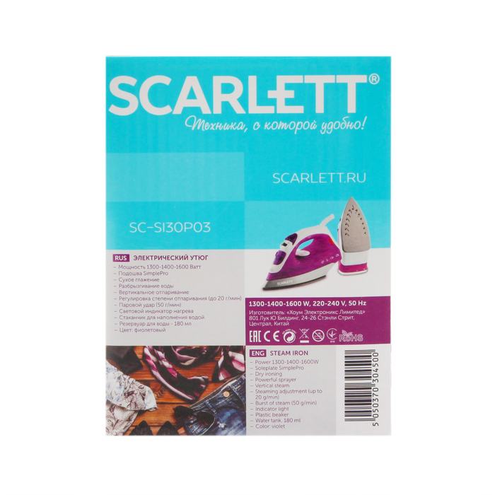 Утюг Scarlett SC-SI30P03, 1300-1600 Вт, паровой удар 50 г/мин, фиолетовый