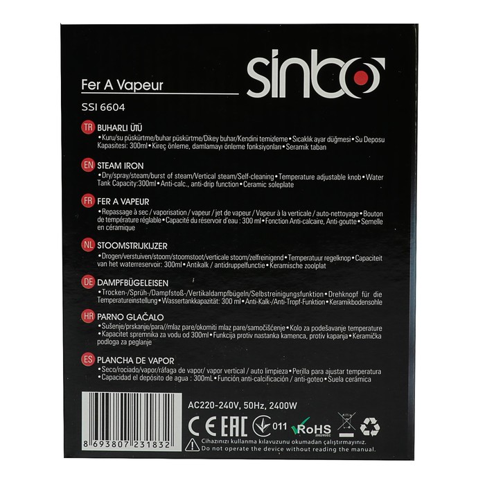 Утюг Sinbo SSI 6604, 2400 Вт, керамическое покрытие, подача пара, синий быстро и безопасно приведёт любую одежду и постельное бельё в порядок. Подошва легко скользит по ткани, разглаживая даже самые непослушные складки. Эргономичная ручка удобно лежит в руке во время глажки. Вы сможете самостоятельно выбрать температурный режим в зависимости от степени деликатности материала.