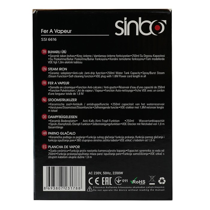 Утюг Sinbo SSI 6616, 2200 Вт, керамическое покрытие, подача пара, фиолетовый