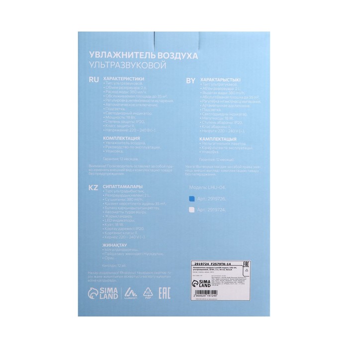 Увлажнитель воздуха LuazON LHU-04, ультразвуковой, 2 л, 18 Вт, белый
