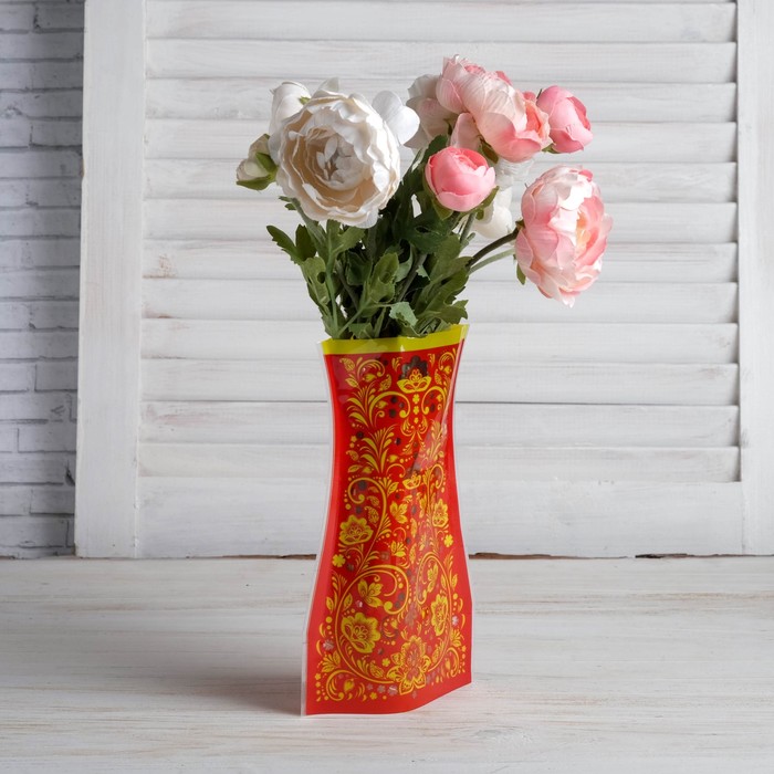 Ваза изготовлена из тонкого пластика. В сложенном виде декор не толще листа бумаги. Налейте в него воду, и он с лёгкостью примет нужную форму.
