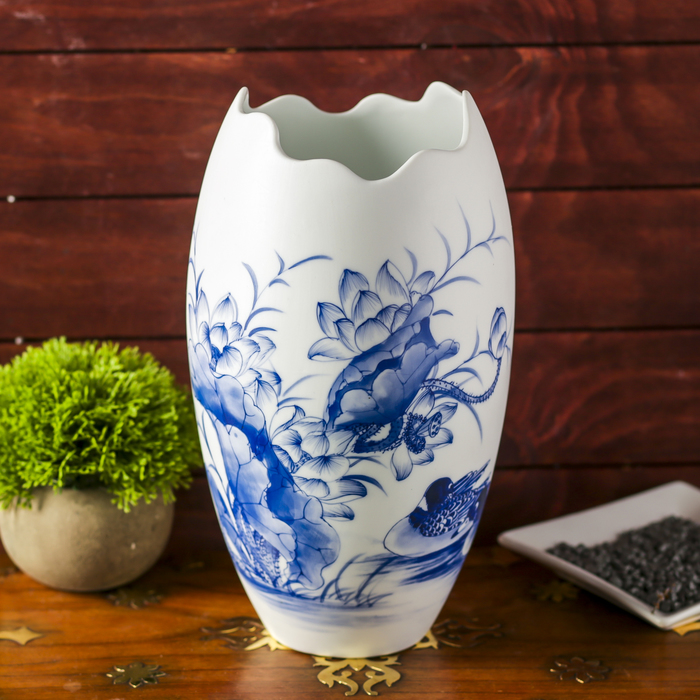 Изысканная керамическая ваза "Пруд" ручной работы, роспись которой напоминает чарующие японские мотивы в стиле гжель. Вы только посмотрите на ровные линии фигуры этого грациозного сосуда, чувствуется, как вьетнамские мастера шаг за шагом создавали его невероятный орнамент. Такая роскошная экзотического творения красавица станет элегантным подарком любой даме, помимо этого она станет актуальным презентом на свадьбу или годовщину.