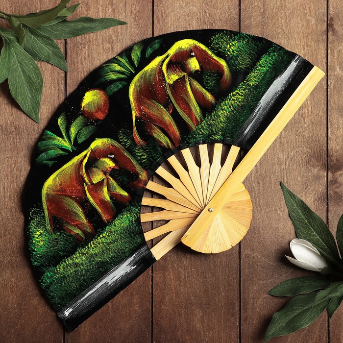 Веер бамбук с блестками "Два слоника друг за другом" 25 см