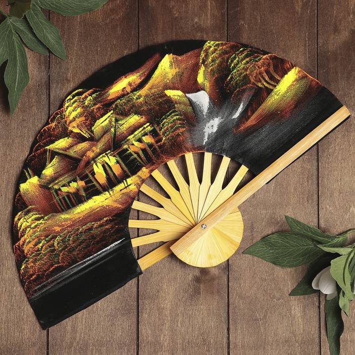 Веер бамбук с блестками "Лодочки в деревне" 25 см