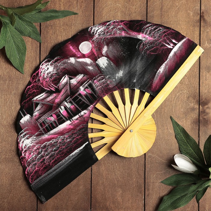 Веер бамбук с блестками "Плантация" фиолетовый фон 25 см