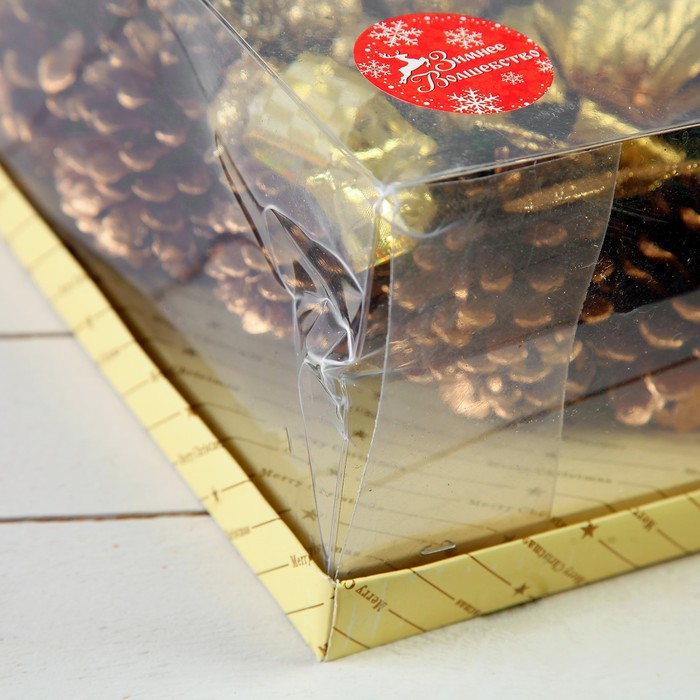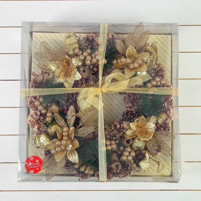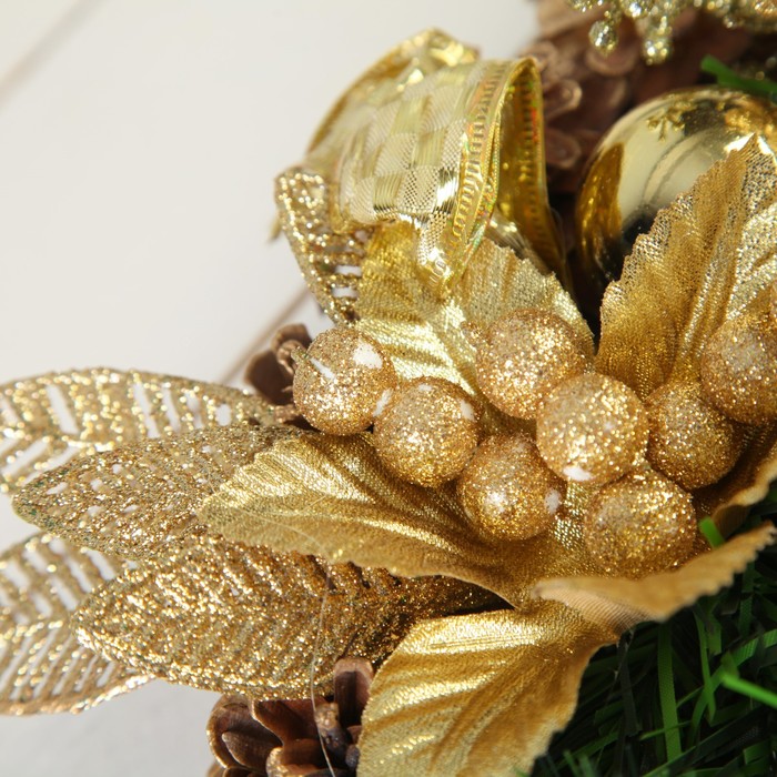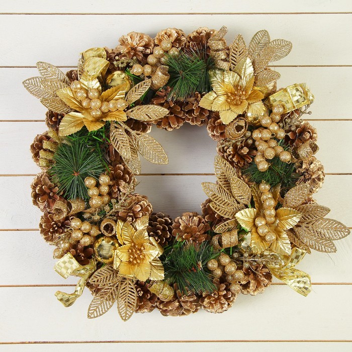 Венок новогодний d-37 см с шишками с позолотой и цветами Уценка