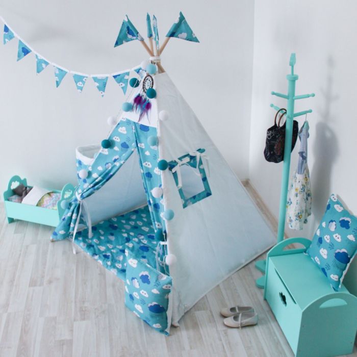 Вигвам для детей с окном, карманом и флажками, облака, 110x110x160 см