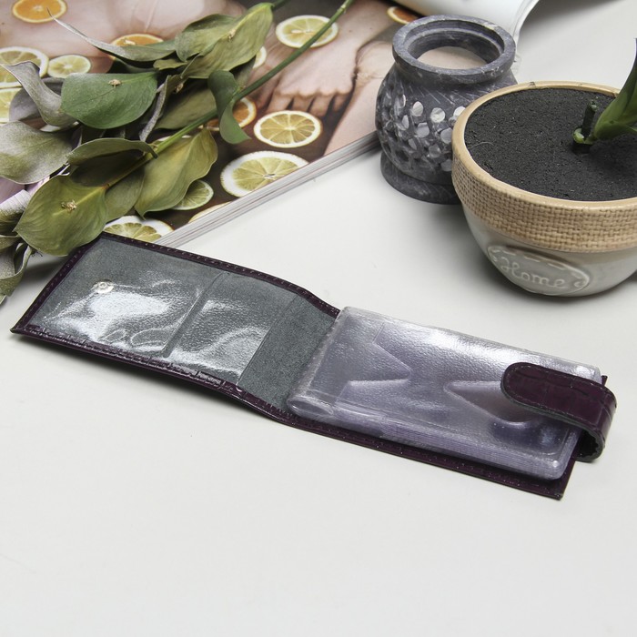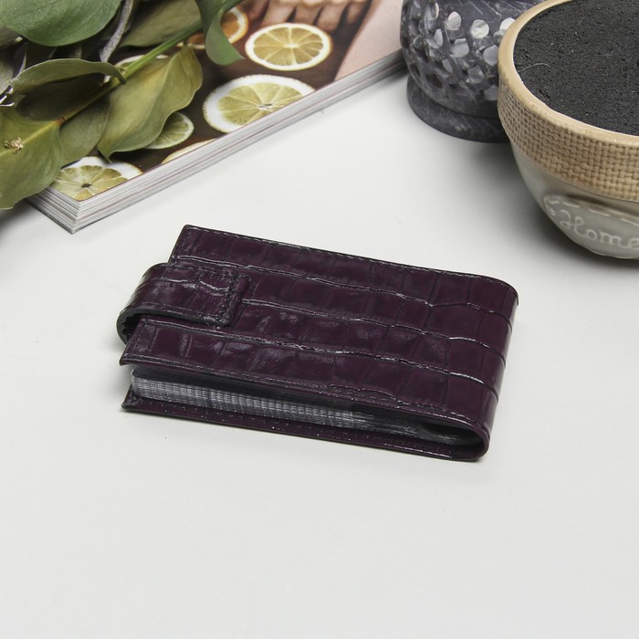 Визитница на кнопке, 1 ряд, 16 листов, крокодил, цвет фиолетовый