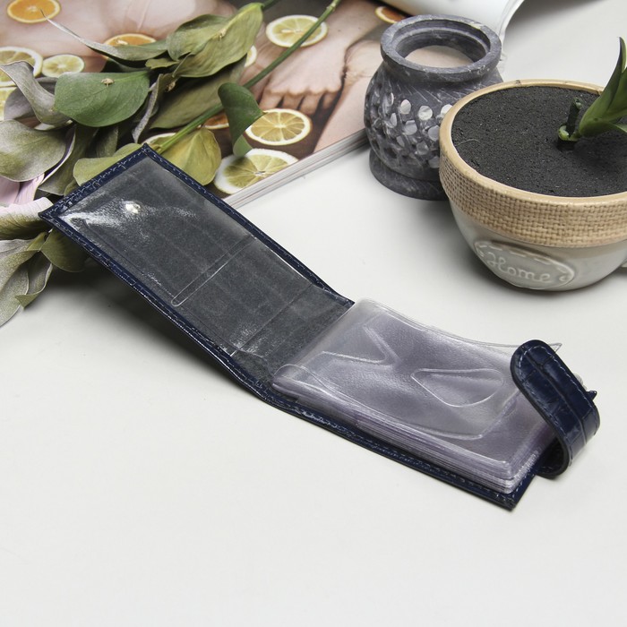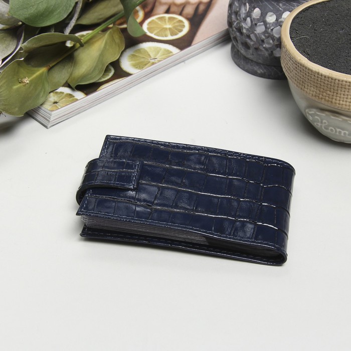 Визитница на кнопке, 1 ряд, 16 листов, крокодил, цвет синий