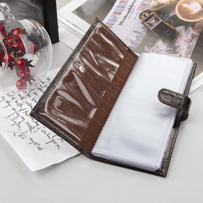 Визитница на кнопке, 2 ряда, 18 листов, крокодил, цвет коричневый