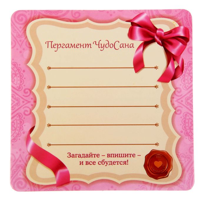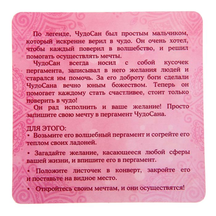 Также в конверт вложен волшебный пергамент ЧудоСана. Напишите на нём самые заветные мечты, положите пергамент в конверт, закройте его и поставьте на видное место. Вскоре ваши мечты осуществятся!