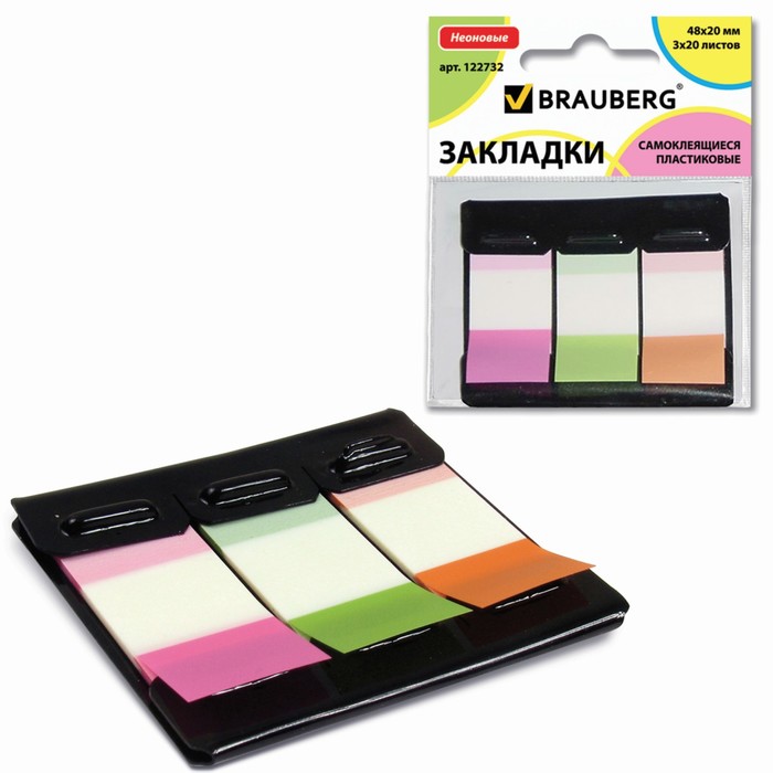 Закладки с липким краем пластиковые BRAUBERG НЕОН, 48х20 мм, 3 цвета по 20 листов