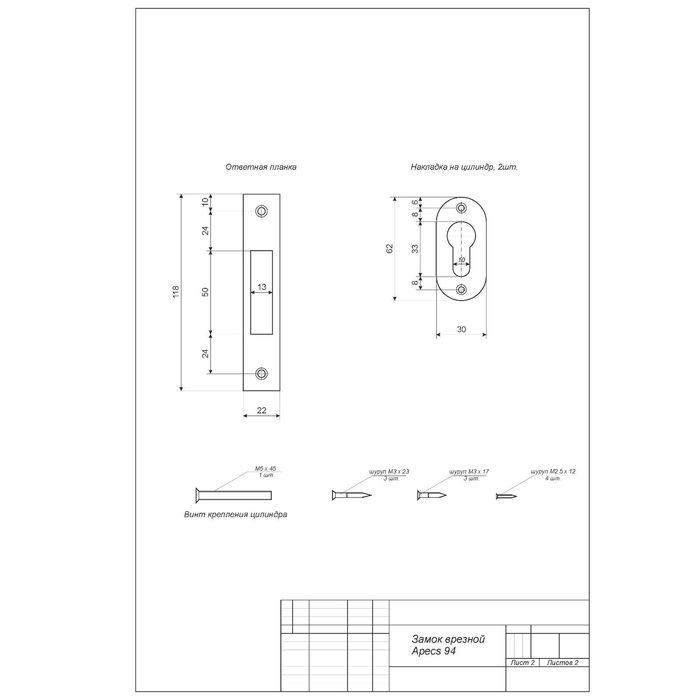 Замок врезной Apecs 94-H/60-CR (940 M), краб, 5 ключей