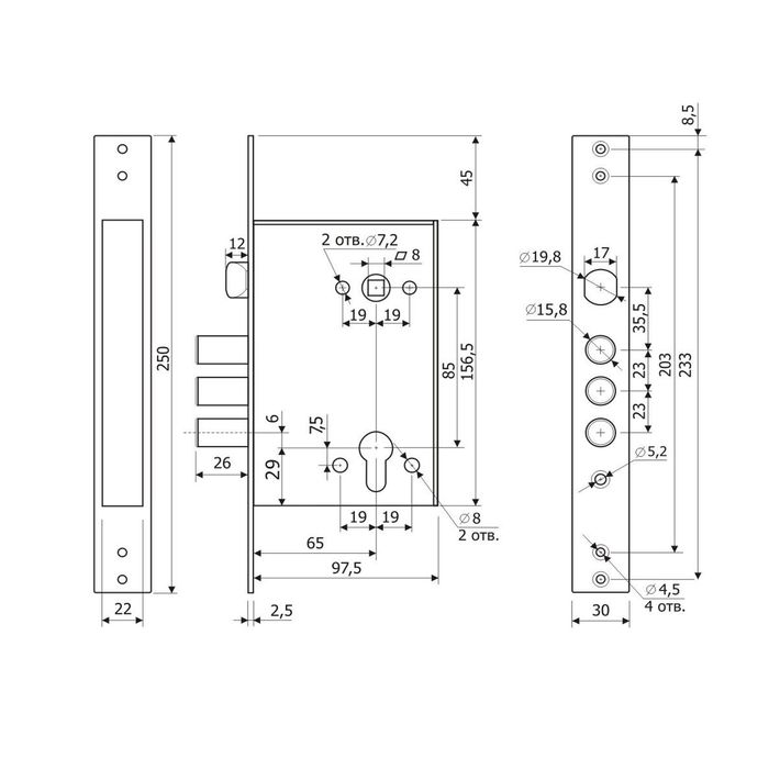 Врезной замок устанавливается в двери толщиной 40–75 мм. Модель обладает 3 цилиндрическими ригелями диаметром 15,8 мм с максимальным вылетом 26 мм.
