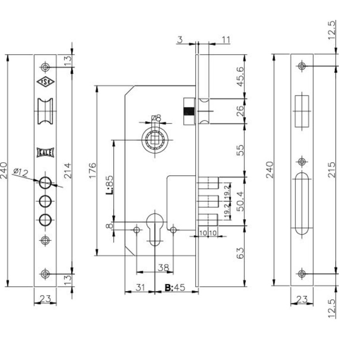 Замок врезной KALE 152/3MR w/b, под ц/м, 45 мм, цвет хром