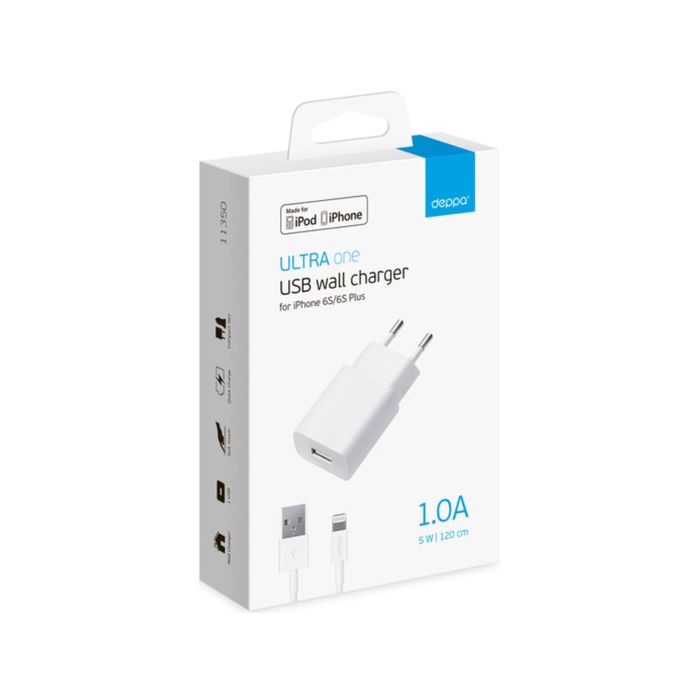 Зарядное устройство Deppa (11350) Ultra, MFI Apple 8-pin iPhone 5/6/7, 1000 mA, белый