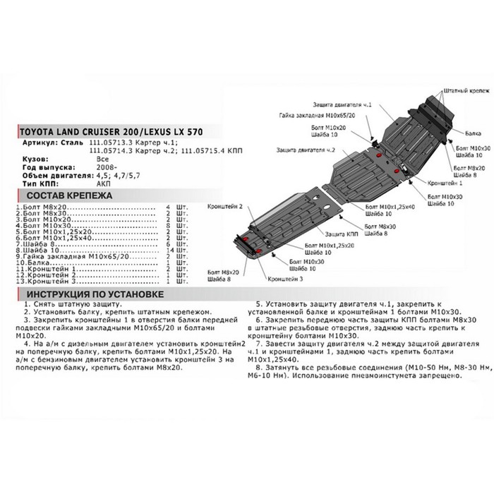 Защита картера АвтоБРОНЯ (часть 1) для Lexus LX (V - 5.7) 2008-2015, крепеж в комплекте, сталь, 2 мм, 111.05713.3