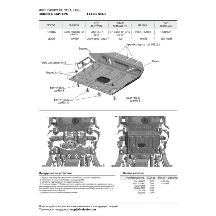 Защита картера АвтоБРОНЯ (часть 2) для Toyota Land Cruiser 150 Prado (V - 2.7; 3.0d; 4.0; 2.8d) 2009-2017 / (V - 2.7; 4.0) 2017-н.в., крепеж в комплекте, сталь, 2 мм, 111.05784.1
