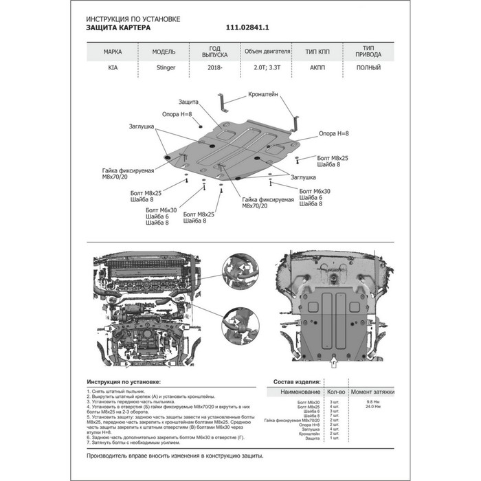Защита картера АвтоБРОНЯ для Kia Stinger (V - 2.0T; 3.3T / AWD) 2018-н.в., крепеж в комплекте, сталь, 2 мм, 111.02841.1