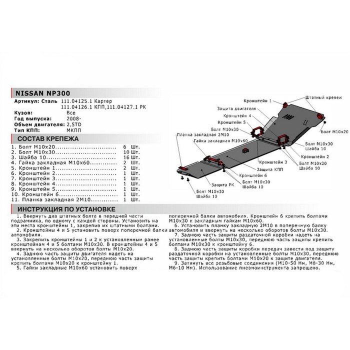 Защита картера АвтоБРОНЯ для Nissan NP 300 (V - 2.5d) 2008-2015, крепеж в комплекте, сталь, 2 мм, 111.04125.1
