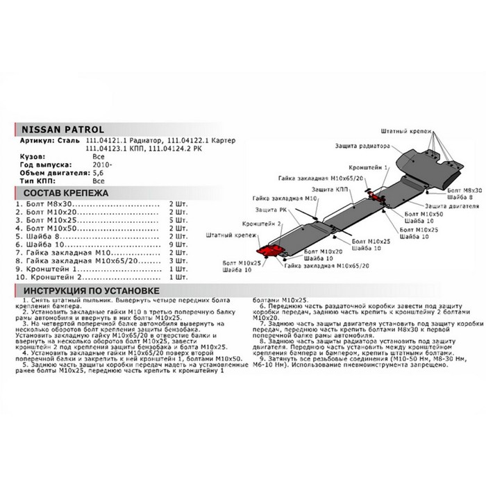 Не секрет, что машина давно уже перестала восприниматься как просто средство передвижения, и водители покупают всё лучшее для своих железных коней. Защита картера АвтоБРОНЯ для Nissan Patrol (V - 5.6) 2010-н.в., крепеж в комплекте, сталь, 2 мм, 111.04122.1 — идеальный выбор, если вы ставите целью и улучшение технических характеристик, и поддержание внешнего вида автомобиля.
