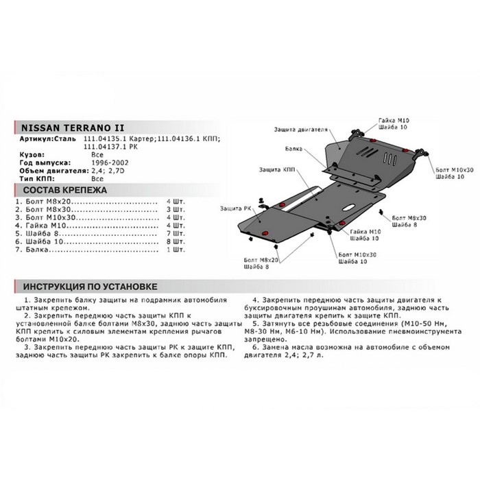 Защита картера АвтоБРОНЯ для Nissan Terrano (V - 2.4; 2.7d) 1996-2002, крепеж в комплекте, сталь, 2 мм, 111.04135.1