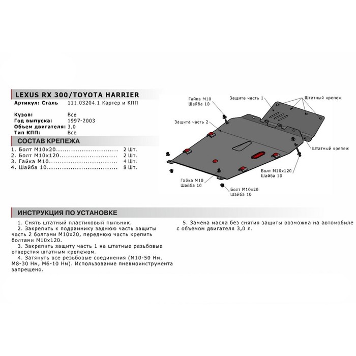 Защита картера АвтоБРОНЯ для Toyota Harrier (V - 3.0) 1997-2003, крепеж в комплекте, сталь, 2 мм, 111.03204.1