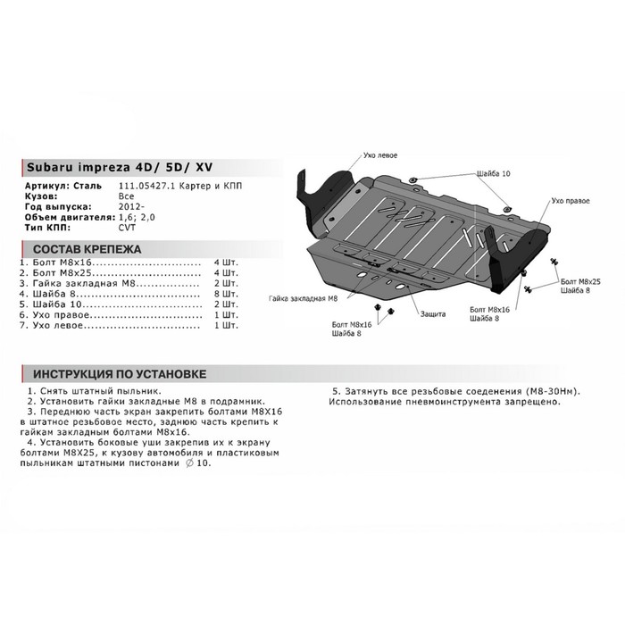 Не секрет, что машина давно уже перестала восприниматься как просто средство передвижения, и водители покупают всё лучшее для своих железных коней. Защита картера АвтоБРОНЯ (увеличенная) для Subaru Impreza (V - 1.6; 2.0) 2012-н.в., крепеж в комплекте, сталь, 2 мм, 111.05427.1 — идеальный выбор, если вы ставите целью и улучшение технических характеристик, и поддержание внешнего вида автомобиля.