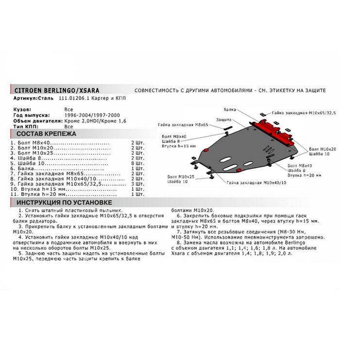 Не секрет, что машина давно уже перестала восприниматься как просто средство передвижения, и водители покупают всё лучшее для своих железных коней. Защита картера и КПП АвтоБРОНЯ для Citroen Berlingo (V - кроме 2.0d) 1996-2004, крепеж в комплекте, сталь, 2 мм, 111.01206.1 — идеальный выбор, если вы ставите целью и улучшение технических характеристик, и поддержание внешнего вида автомобиля.
