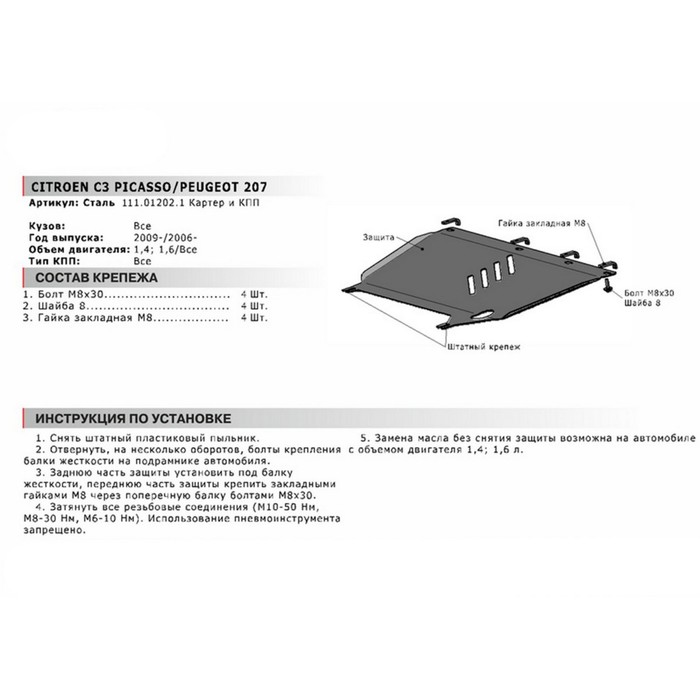 Не секрет, что машина давно уже перестала восприниматься как просто средство передвижения, и водители покупают всё лучшее для своих железных коней. Защита картера и КПП АвтоБРОНЯ для Citroen C3 Picasso (V - 1.4; 1.6) 2009-2012, крепеж в комплекте, сталь, 2 мм, 111.01202.1 — идеальный выбор, если вы ставите целью и улучшение технических характеристик, и поддержание внешнего вида автомобиля.