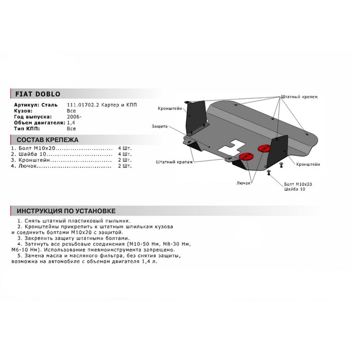 Не секрет, что машина давно уже перестала восприниматься как просто средство передвижения, и водители покупают всё лучшее для своих железных коней. Защита картера и КПП АвтоБРОНЯ для Fiat Doblo (V - 1.4) 2006-2015, крепеж в комплекте, сталь, 2 мм, 111.01702.2 — идеальный выбор, если вы ставите целью и улучшение технических характеристик, и поддержание внешнего вида автомобиля.