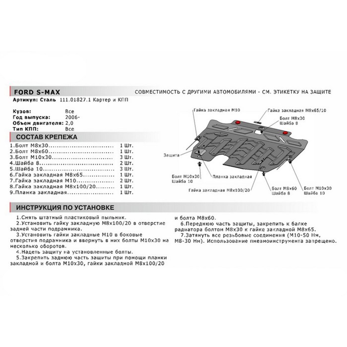 Не секрет, что машина давно уже перестала восприниматься как просто средство передвижения, и водители покупают всё лучшее для своих железных коней. Защита картера и КПП АвтоБРОНЯ для Ford S-Max (V - 2.0) 2006-2015, крепеж в комплекте, сталь, 2 мм, 111.01827.1 — идеальный выбор, если вы ставите целью и улучшение технических характеристик, и поддержание внешнего вида автомобиля.