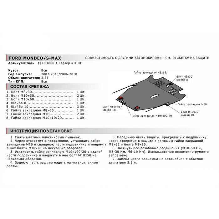 Не секрет, что машина давно уже перестала восприниматься как просто средство передвижения, и водители покупают всё лучшее для своих железных коней. Защита картера и КПП АвтоБРОНЯ для Ford S-Max (V - 2.5Т) 2006-2010, крепеж в комплекте, сталь, 2 мм, 111.01808.1 — идеальный выбор, если вы ставите целью и улучшение технических характеристик, и поддержание внешнего вида автомобиля.