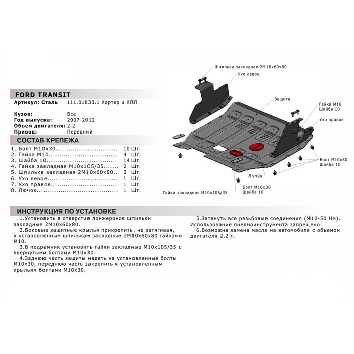 Защита картера и КПП АвтоБРОНЯ для Ford Transit (V - 2.2d / FWD) 2007-2014, крепеж в комплекте, сталь, 2 мм, 111.01833.1