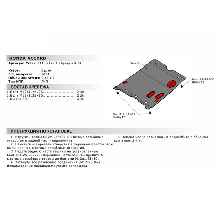 Не секрет, что машина давно уже перестала восприниматься как просто средство передвижения, и водители покупают всё лучшее для своих железных коней. Защита картера и КПП АвтоБРОНЯ для Honda Accord (V - 2.4; 3.5) 2013-2016, крепеж в комплекте, сталь, 2 мм, 111.02126.1 — идеальный выбор, если вы ставите целью и улучшение технических характеристик, и поддержание внешнего вида автомобиля.