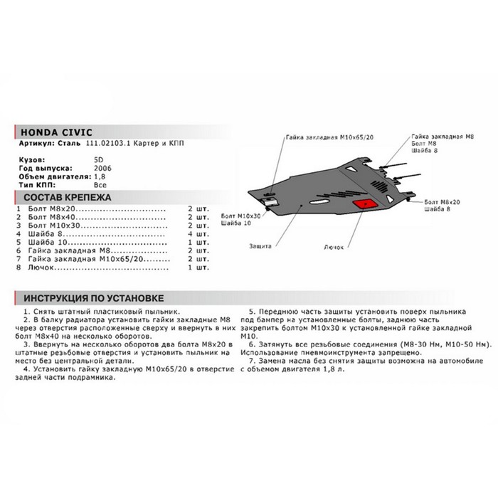 Не секрет, что машина давно уже перестала восприниматься как просто средство передвижения, и водители покупают всё лучшее для своих железных коней. Защита картера и КПП АвтоБРОНЯ для Honda Civic хэтчбек 5-дв. (V - 1.8) 2006-2012, крепеж в комплекте, сталь, 2 мм, 111.02103.1 — идеальный выбор, если вы ставите целью и улучшение технических характеристик, и поддержание внешнего вида автомобиля.