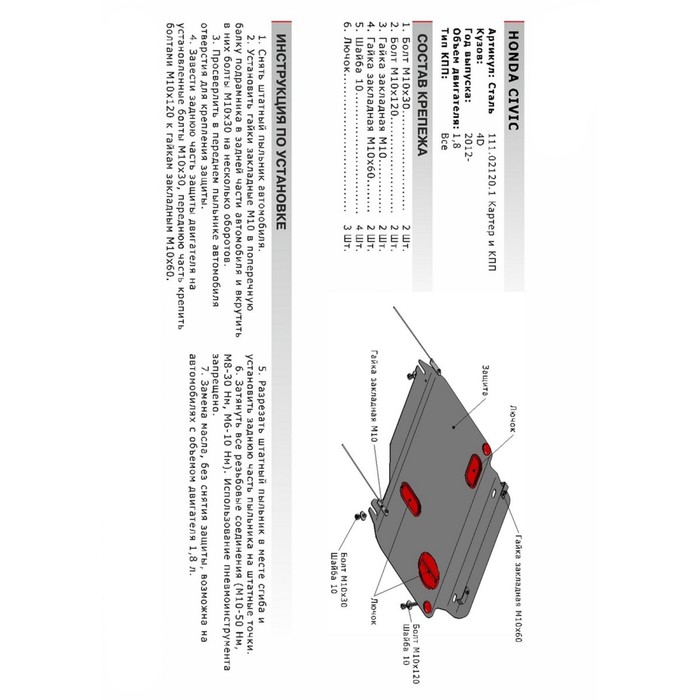 Не секрет, что машина давно уже перестала восприниматься как просто средство передвижения, и водители покупают всё лучшее для своих железных коней. Защита картера и КПП АвтоБРОНЯ для Honda Civic седан (V - 1.8) 2013-2015, крепеж в комплекте, сталь, 2 мм, 111.02120.1 — идеальный выбор, если вы ставите целью и улучшение технических характеристик, и поддержание внешнего вида автомобиля.