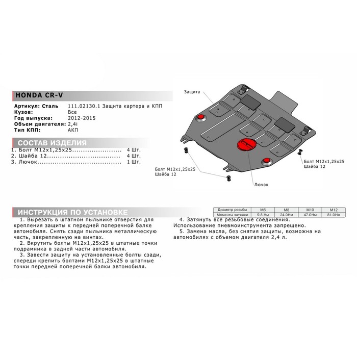 Не секрет, что машина давно уже перестала восприниматься как просто средство передвижения, и водители покупают всё лучшее для своих железных коней. Защита картера и КПП АвтоБРОНЯ для Honda CR-V (V - 2.4) 2012-2015, крепеж в комплекте, сталь, 2 мм, 111.02130.1 — идеальный выбор, если вы ставите целью и улучшение технических характеристик, и поддержание внешнего вида автомобиля.