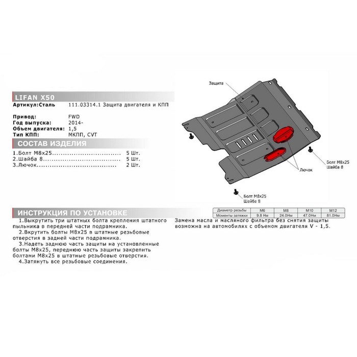 Не секрет, что машина давно уже перестала восприниматься как просто средство передвижения, и водители покупают всё лучшее для своих железных коней. Защита картера и КПП АвтоБРОНЯ для Lifan X50 (V - 1.5) 2014-н.в., крепеж в комплекте, сталь, 2 мм, 111.03314.1 — идеальный выбор, если вы ставите целью и улучшение технических характеристик, и поддержание внешнего вида автомобиля.